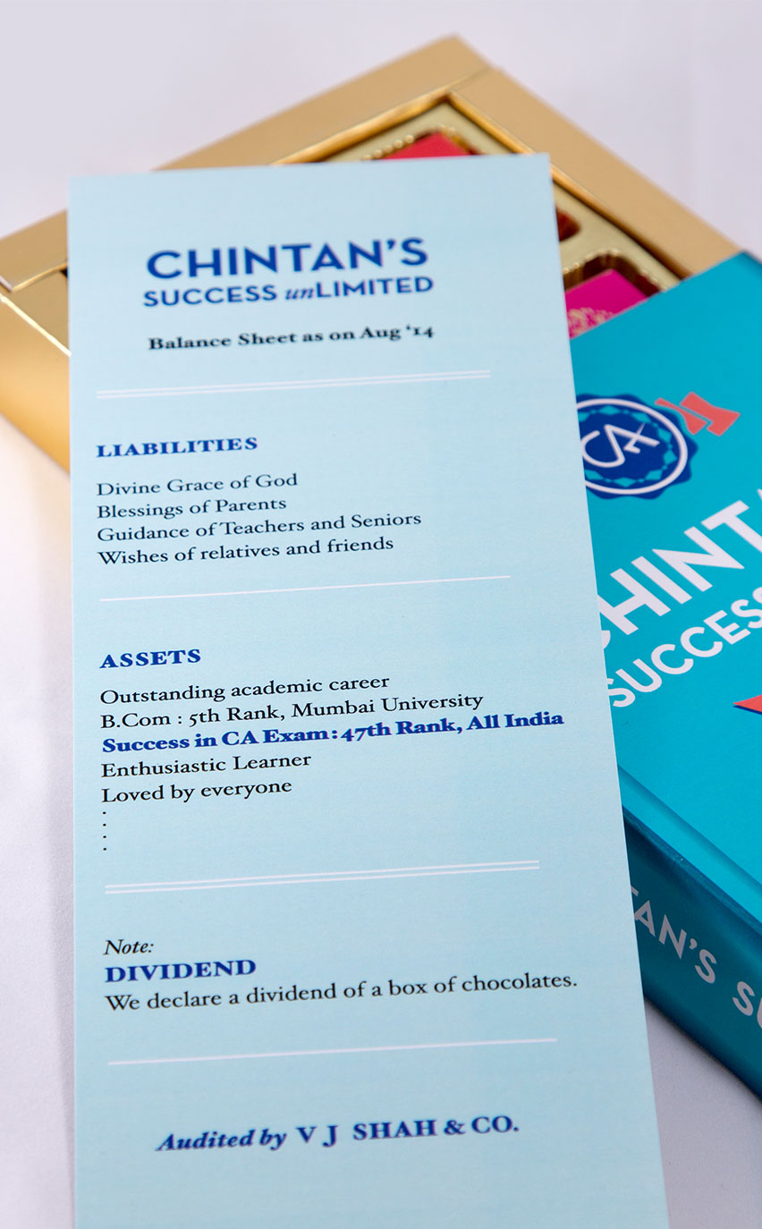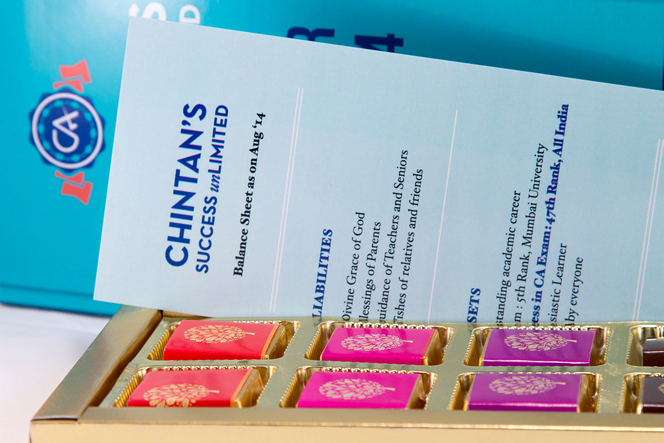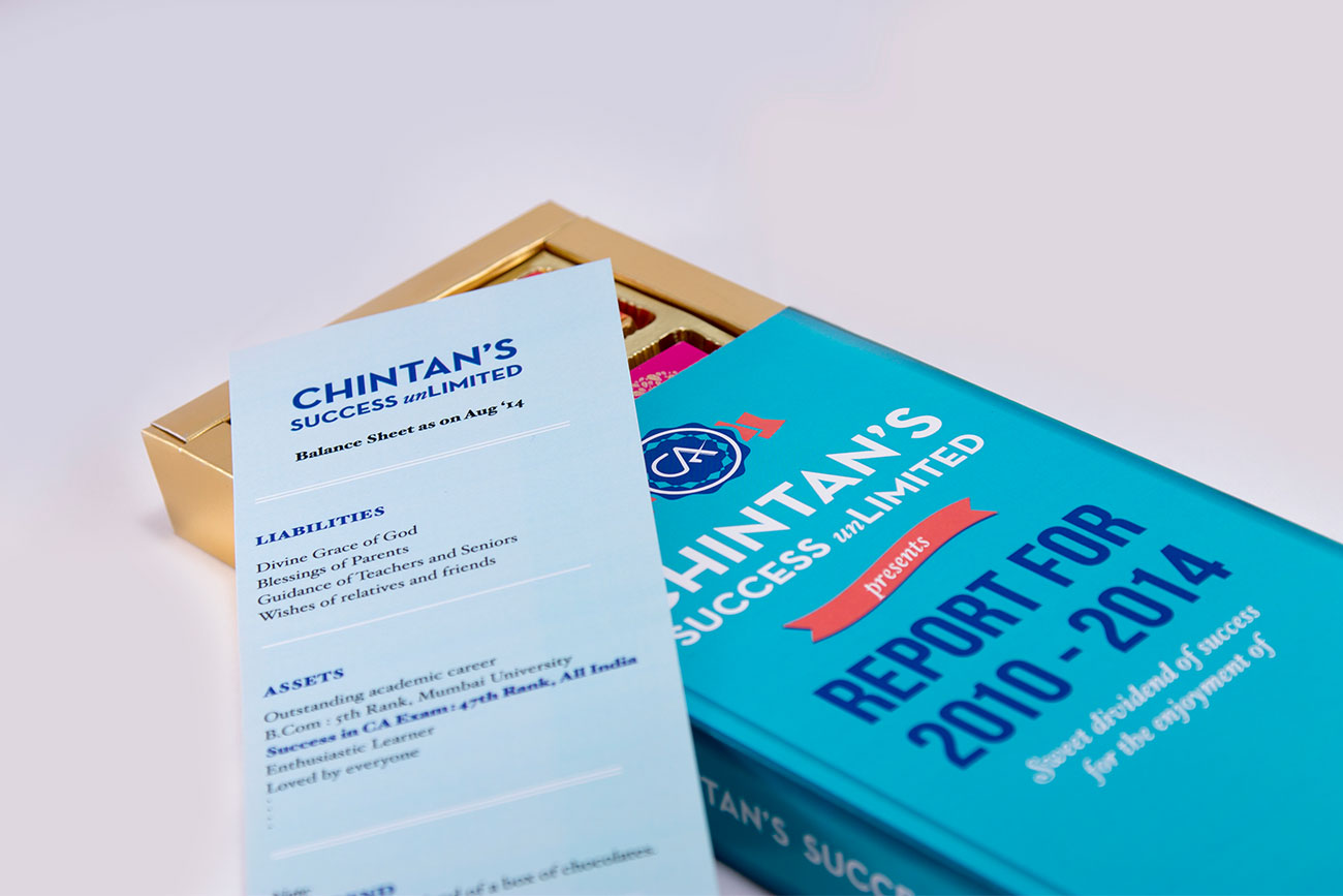 What better way to celebrate a C.A.’s success than to create an annual report that sums up his spectacular performance? Our innovative approach to a simple chocolate box design.