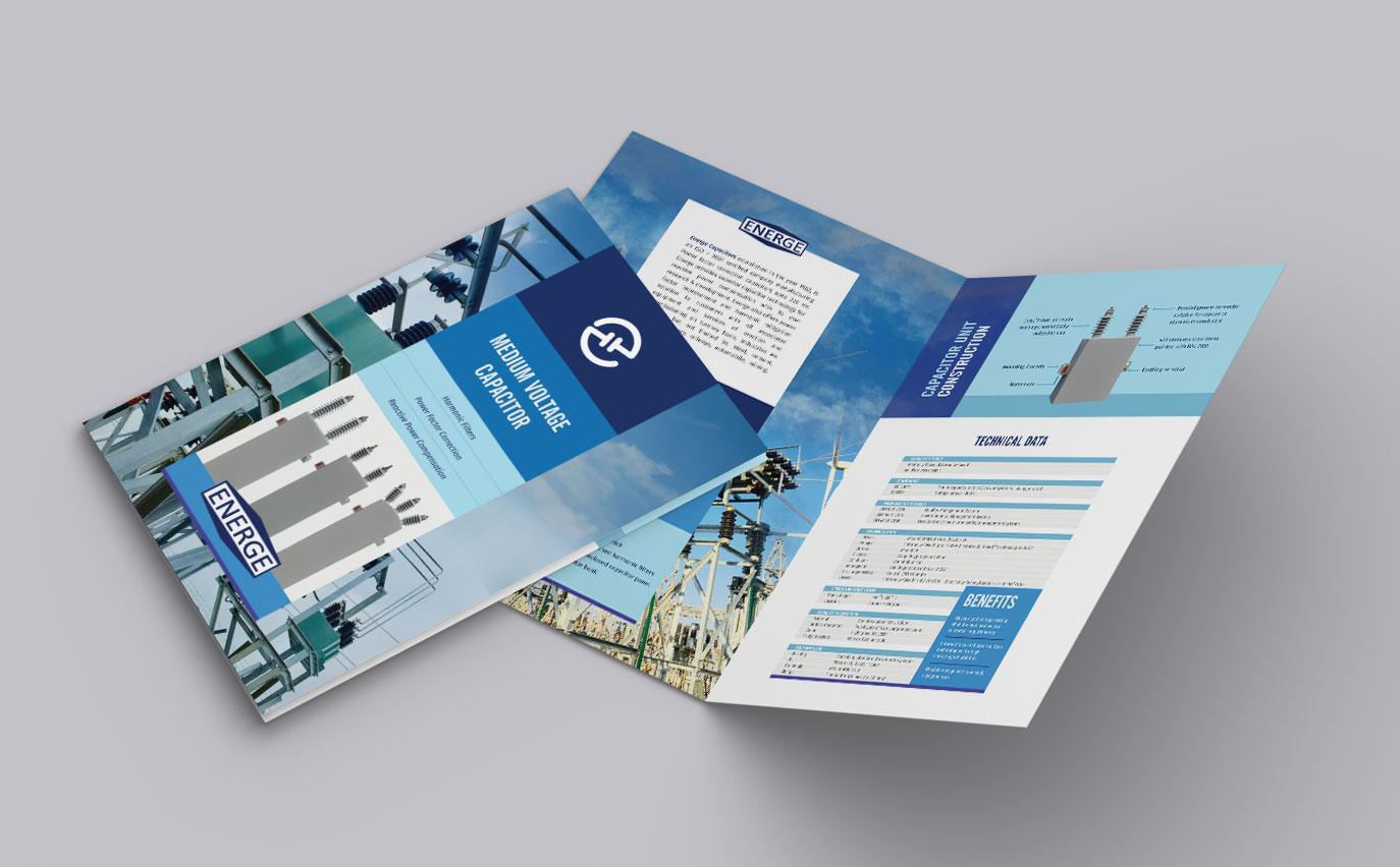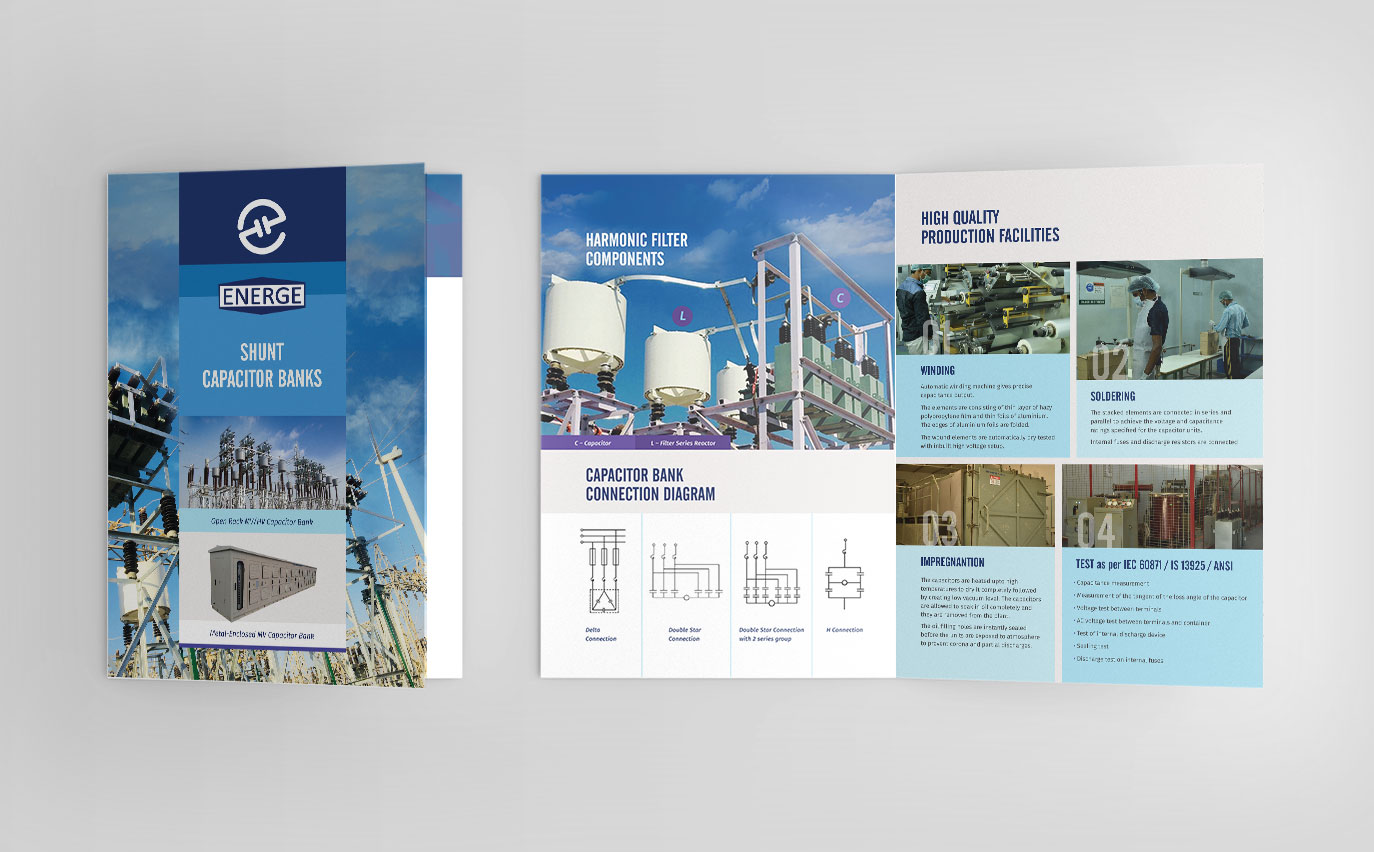 With 𝐄𝐧𝐞𝐫𝐠𝐞 𝐂𝐚𝐩𝐚𝐜𝐢𝐭𝐨𝐫𝐬 we used huge bold patches of their brand colours with their product images. This made the brochure impactful while retaining the corporate look through balanced minimalism.