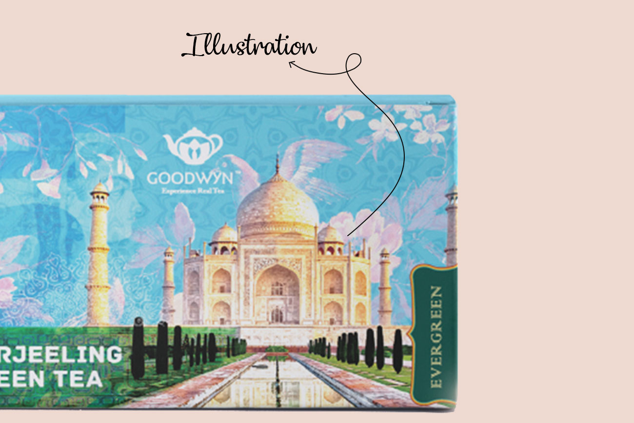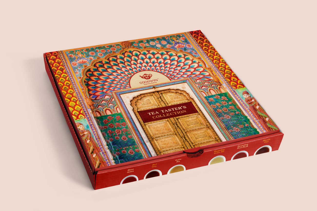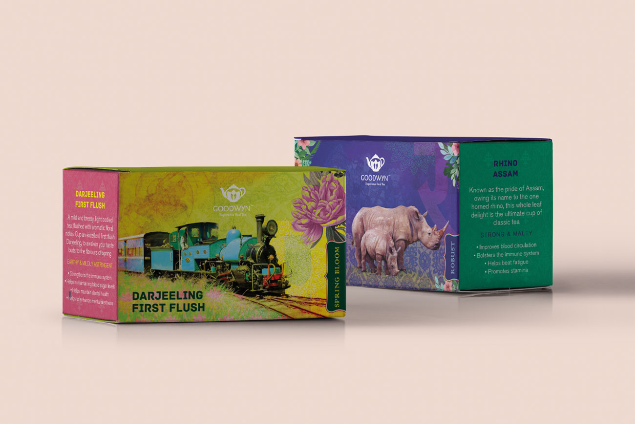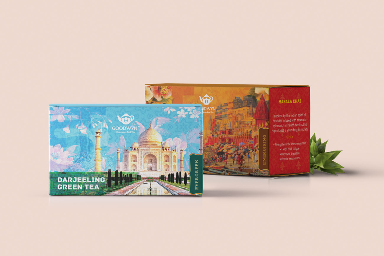 Goodwyn Tea wanted a different take on their existing packaging. A cup of Indian culture with some elegance and a dash contemporary to create the perfect flavor for their NRI audience. A set of 6 flavours would be sold together. Hence these variants had to look cohesive yet showcase their individuality of flavours.