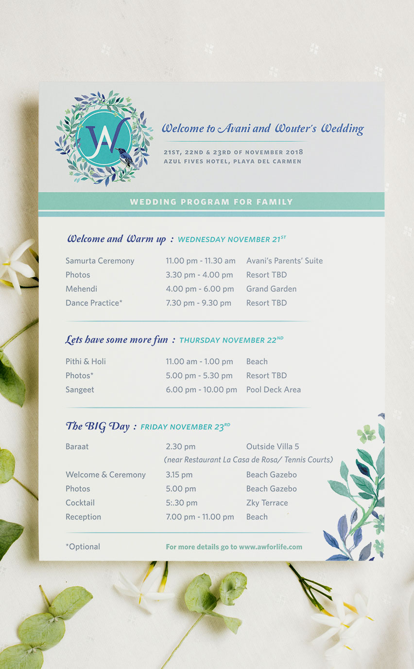 This beachy intimate Mexico wedding was every girl’s dream come true! The lovely hues of blue, white and gold with illustrations of birds and leaves gave the wedding a calm, cozy and relaxed feel. Just how you should be feeling in Mexico. Right?