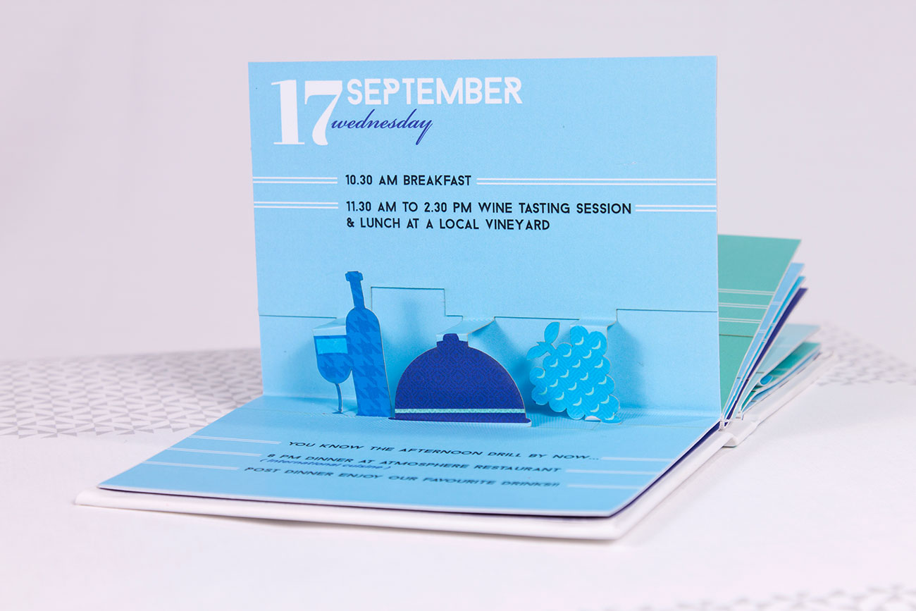 The itinerary was in the form of a quirky pop-up book. The highlights of each day were used to create a lively experience with this interactive pop up book