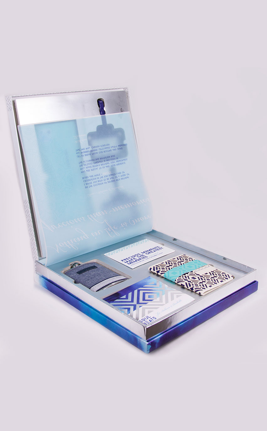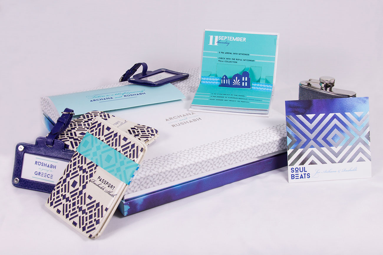 Serene whites, mesmerising blues and classy silvers along with greek patterns were used to capture the flavour of Greece. The invitation box itself had amazing designed products with silver foil and watercolour edges. The itinerary was a pop up book.