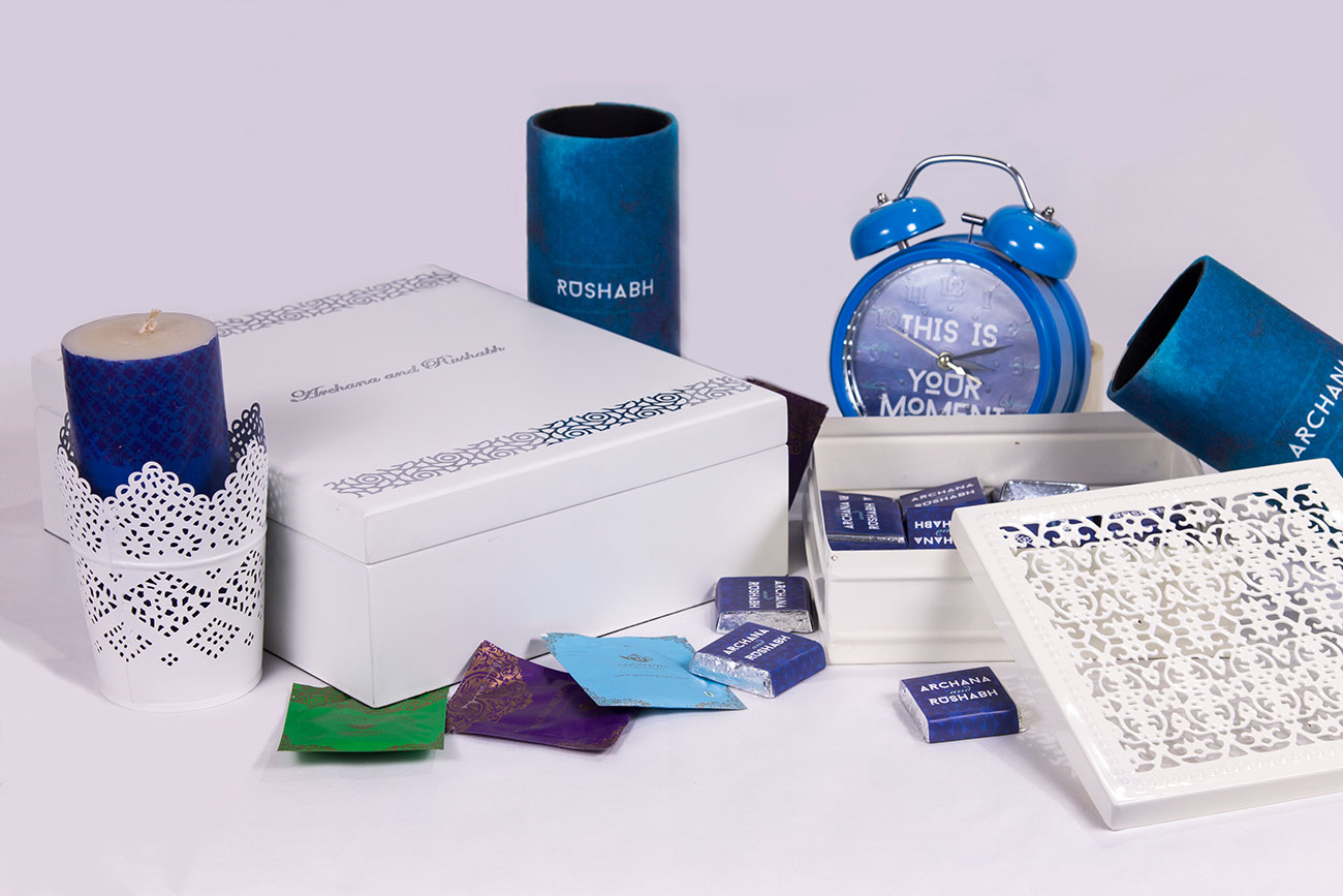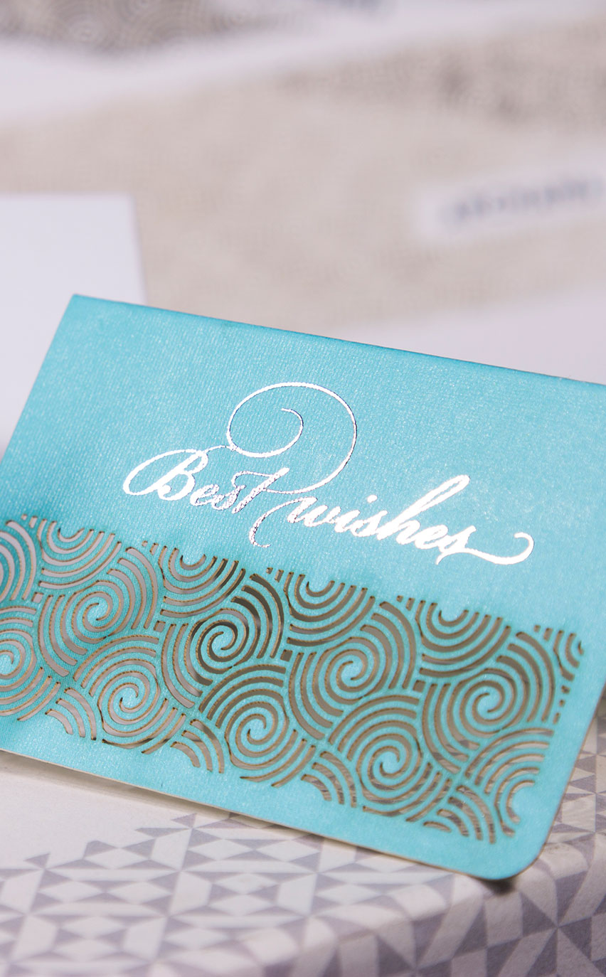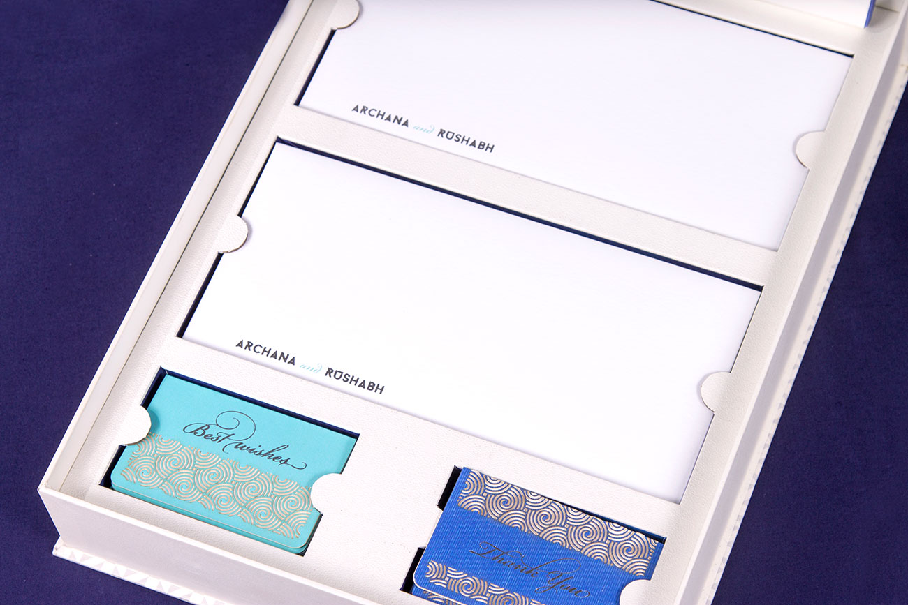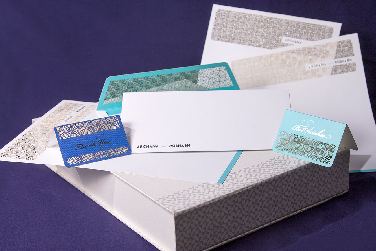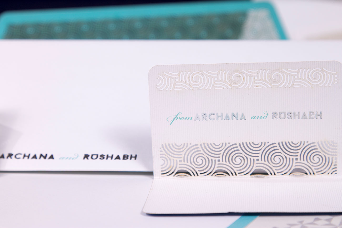 We designed complete personalized stationery for each couple. Consisting of classy, delicate, Laser-cut envelopes, thankyou cards and best wishes cards