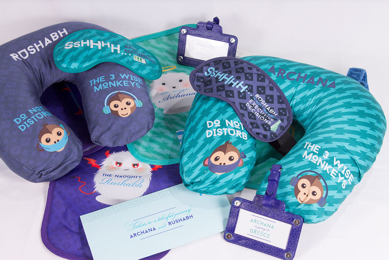 The invite was a personalised box consisting of a complete set for travelling: Luggage tags + Flight Ticket, a personalized CD cover, Passport holder and an itinerary for the entire trip with a beautifully written letter.