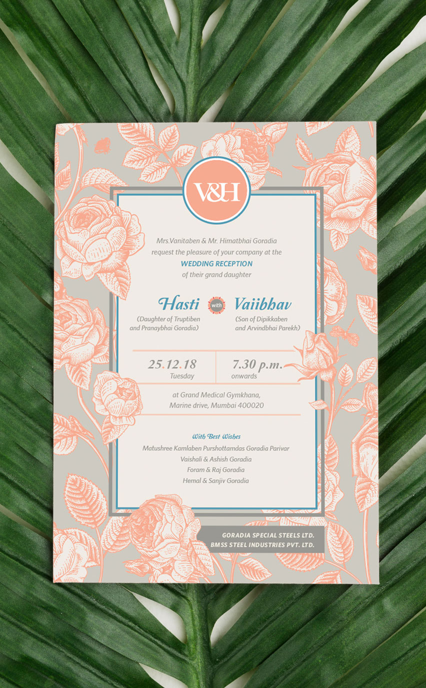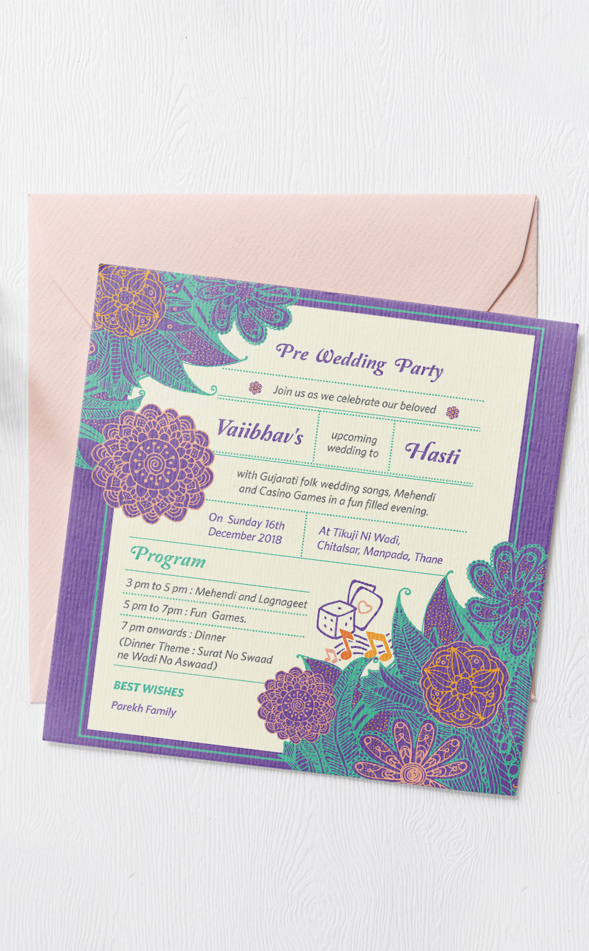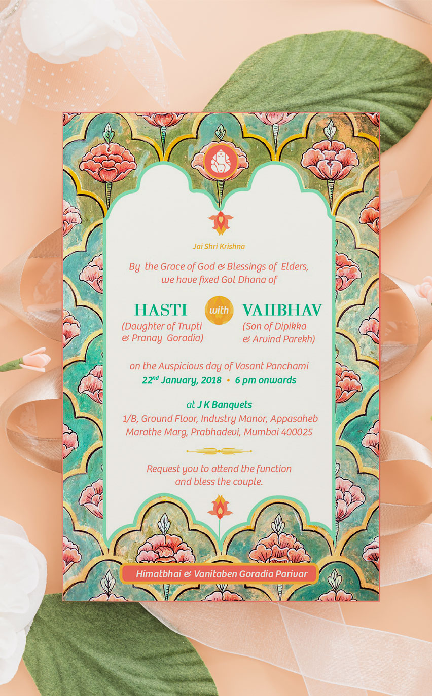 Our quintessential bride Hasti wanted an evite for her Gol Dhana based on her favorite flower: The Lotus. The wedding had to have roses and the Mehendi – Quirky colourful.