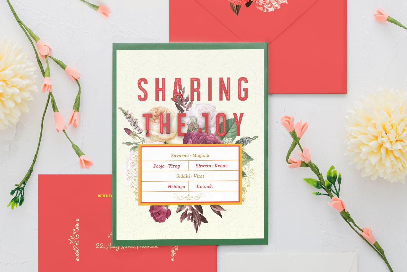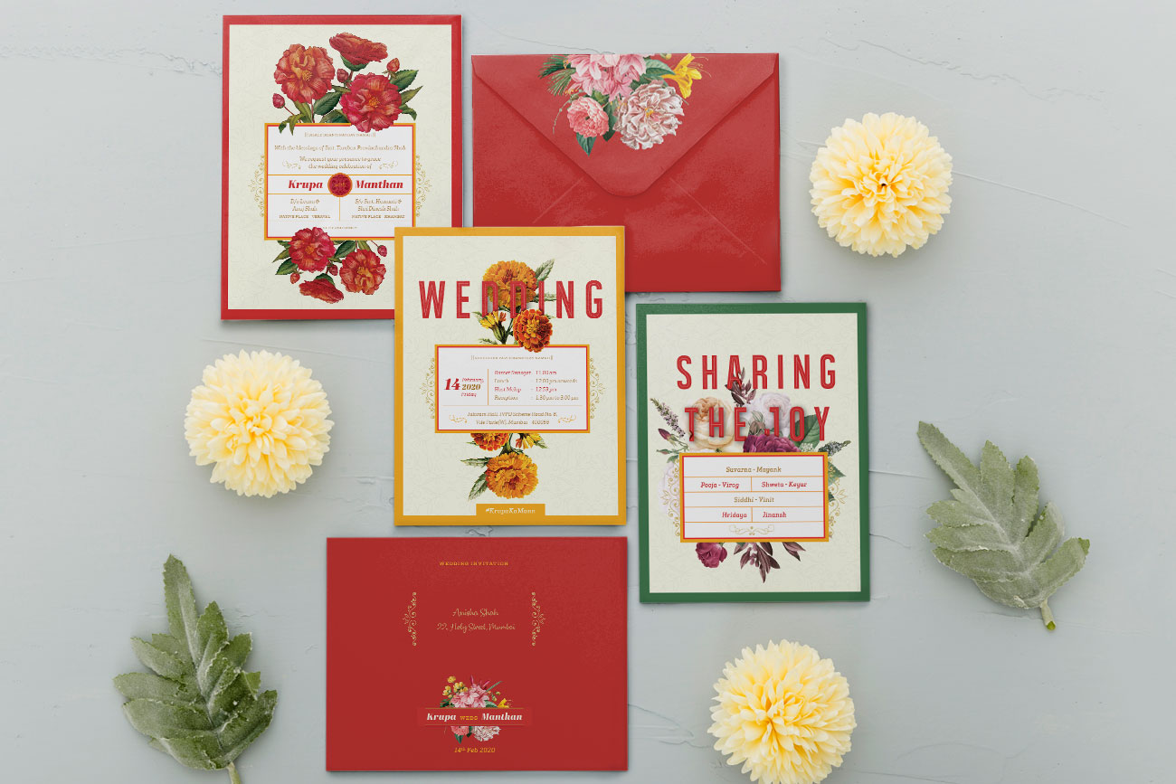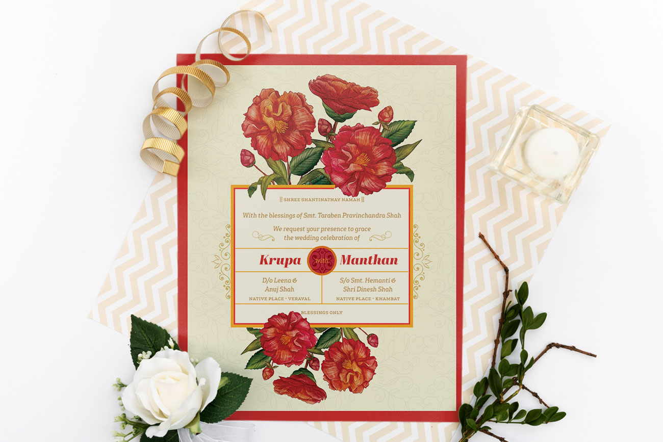 We are in love with bold typography and so is our designer bride Krupa. She wanted a classy, minimal, bold wedding invitation card. We designed the card with 3 beautiful floral typography inserts that were wrapped in a semi translucent custom printed paper. The invite was delivered in a red envelope with floral details. The layouts, the illustrations and the crisp typography made this invite memorable.