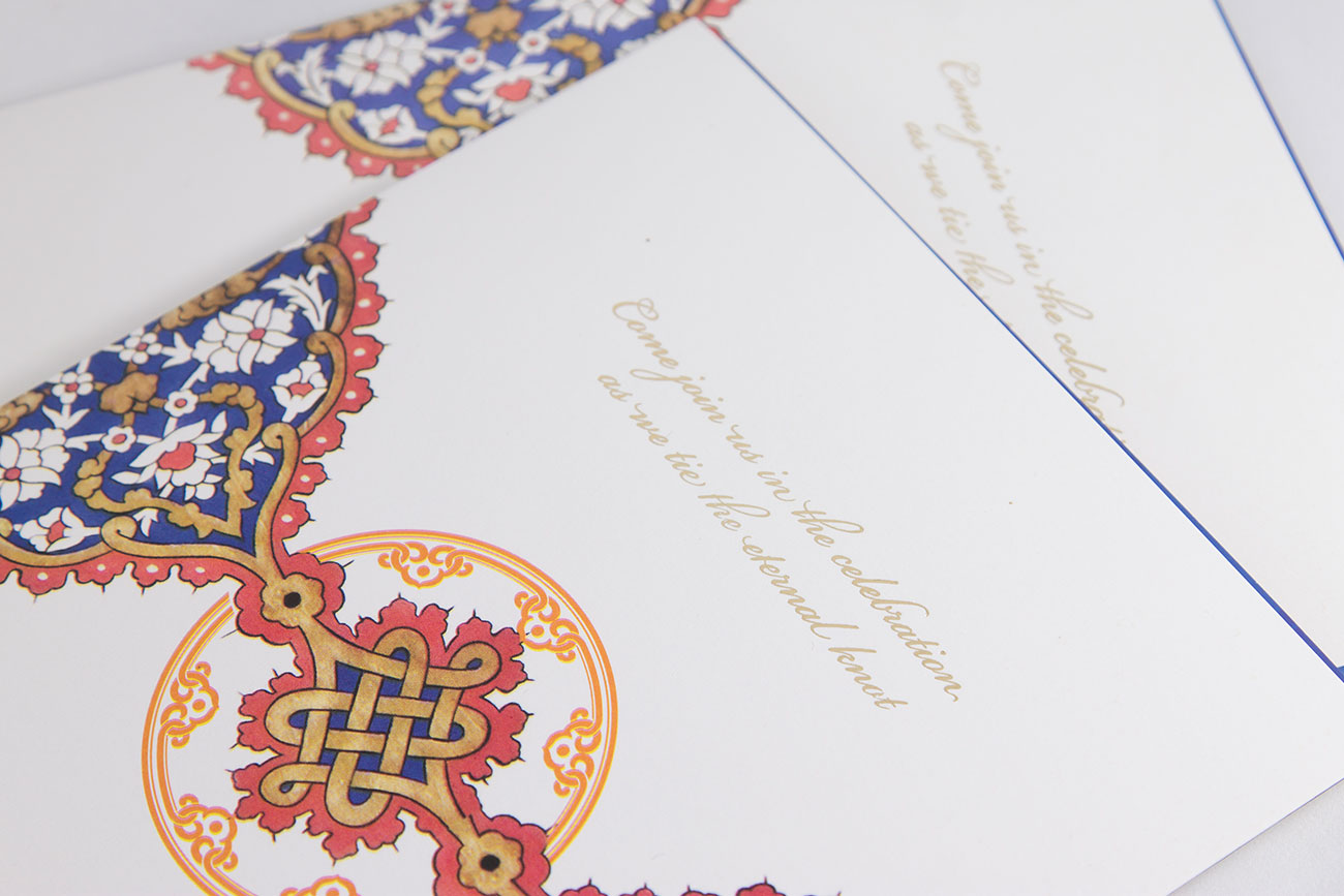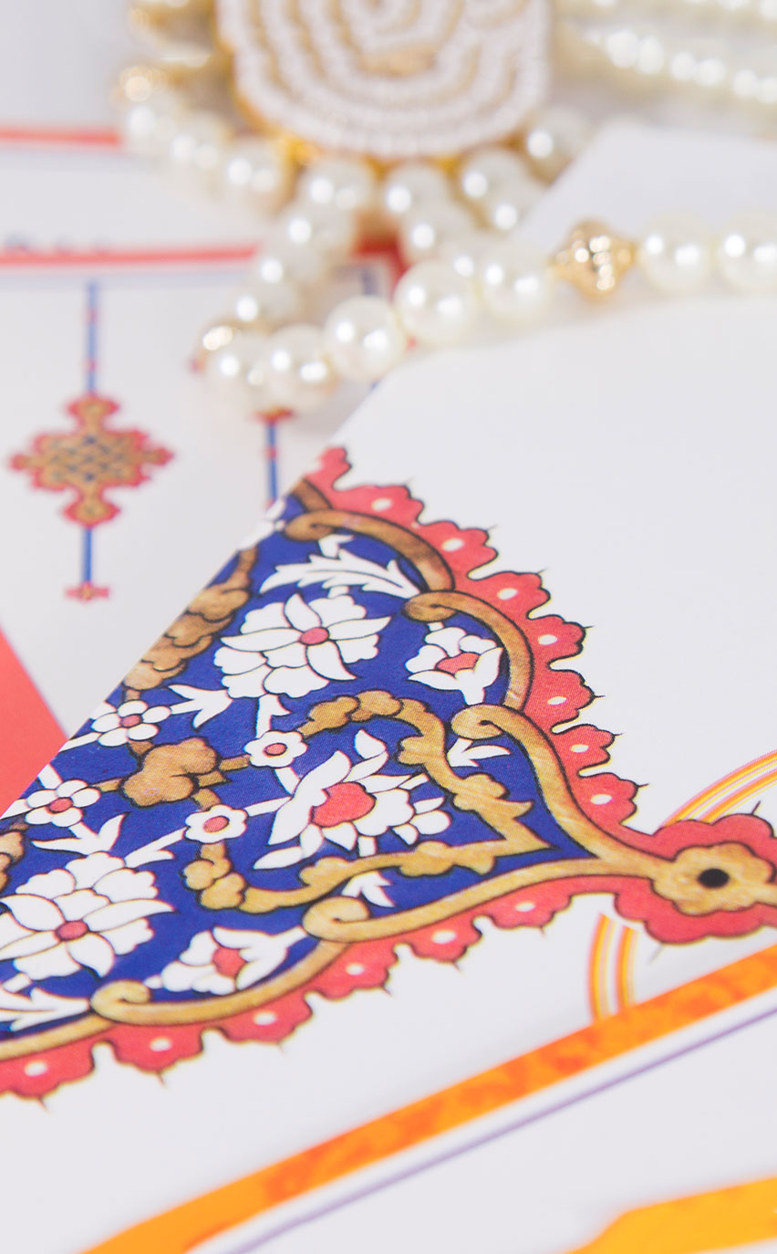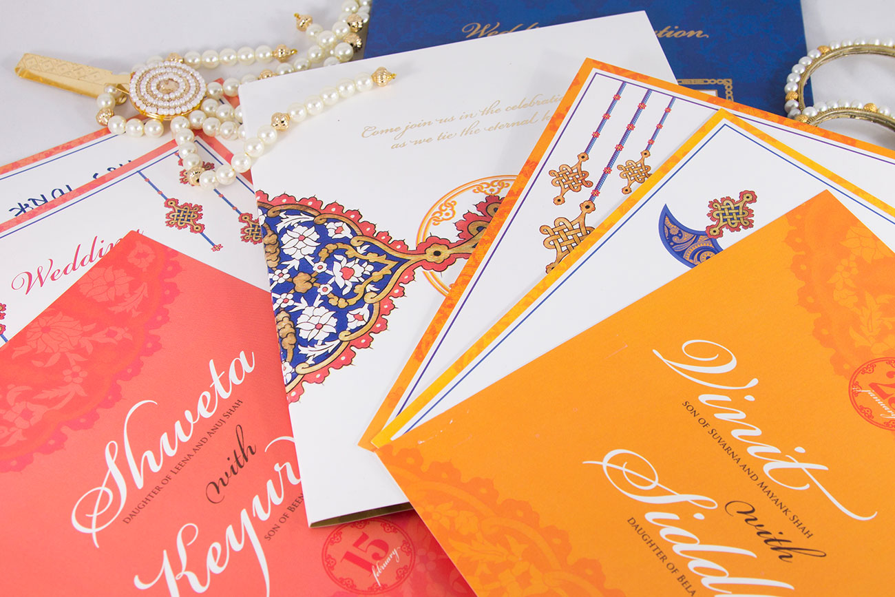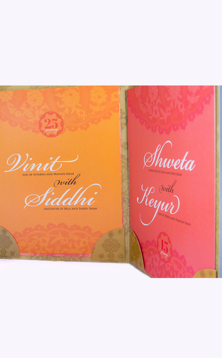 The Shahs came to us to create a wedding card that would encompass 2 weddings in 1 card. With the siblings getting married just a month apart, they needed flexibility of whom to invite to which event.