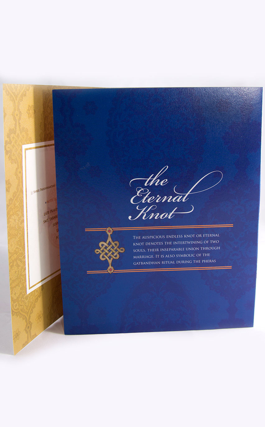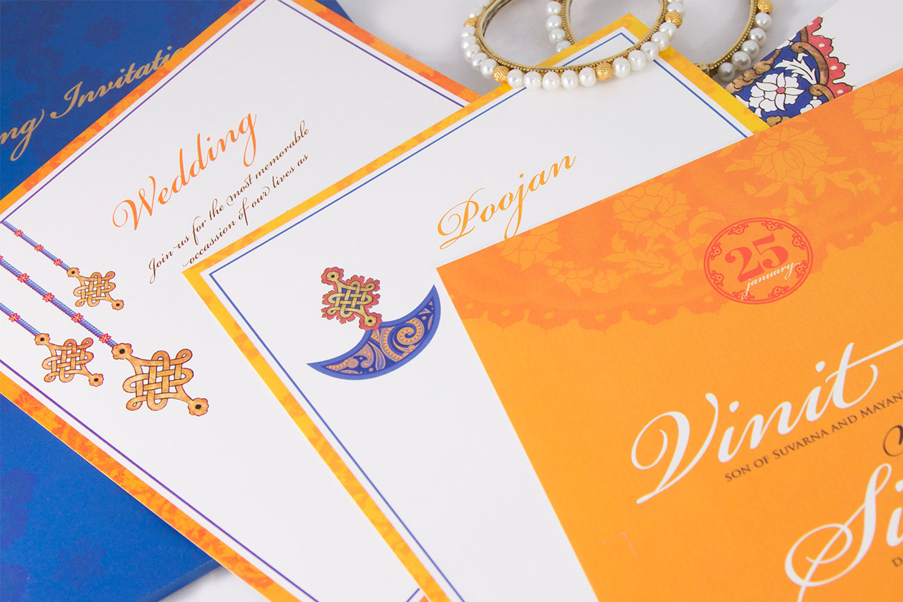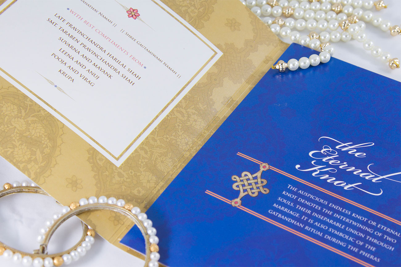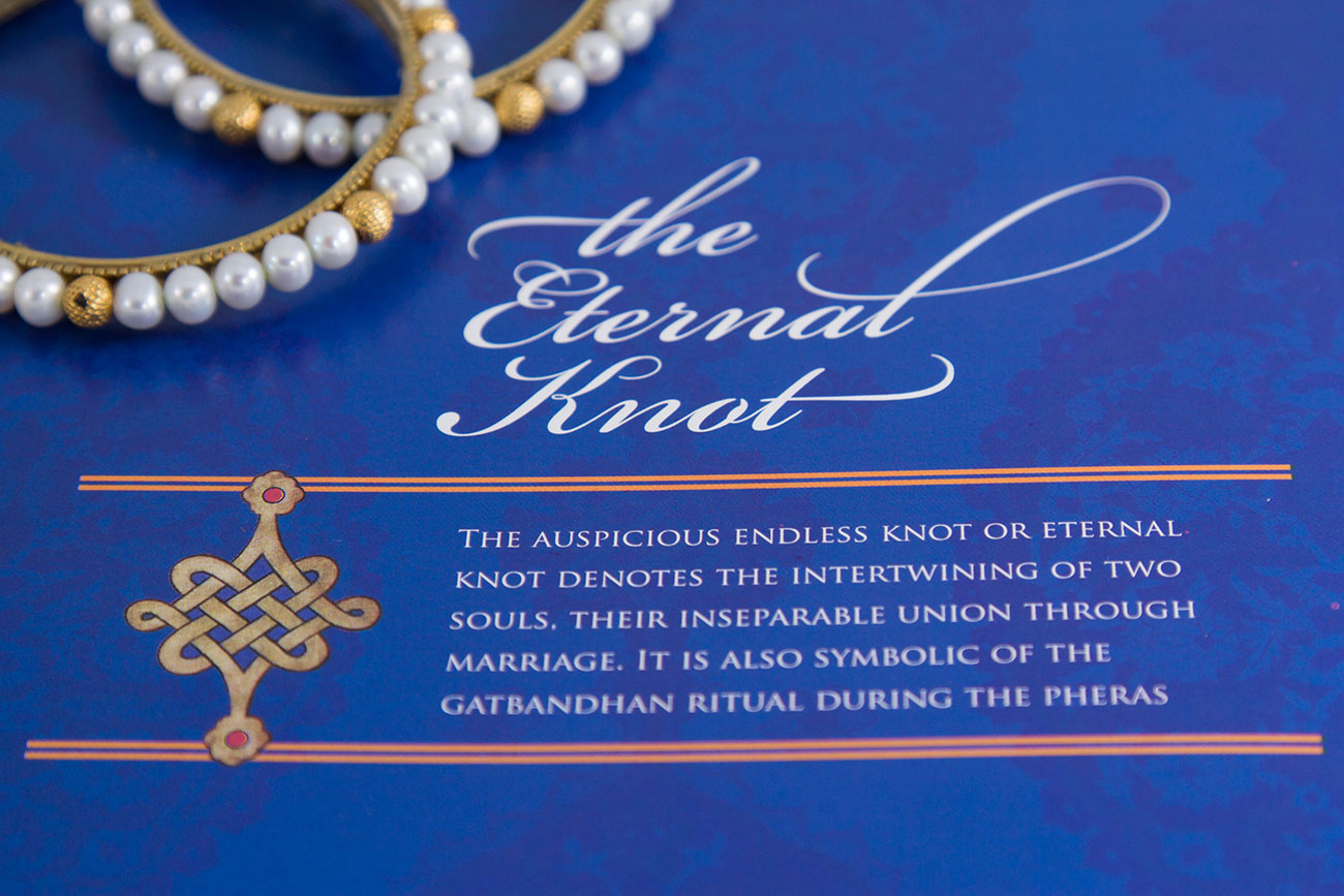 We created the card on the concept of the Eternal Knot – the true essence of marriage. We created a separate colour scheme for each sibling and the inserts lent a very flexible solution to their multiple events and invitations.