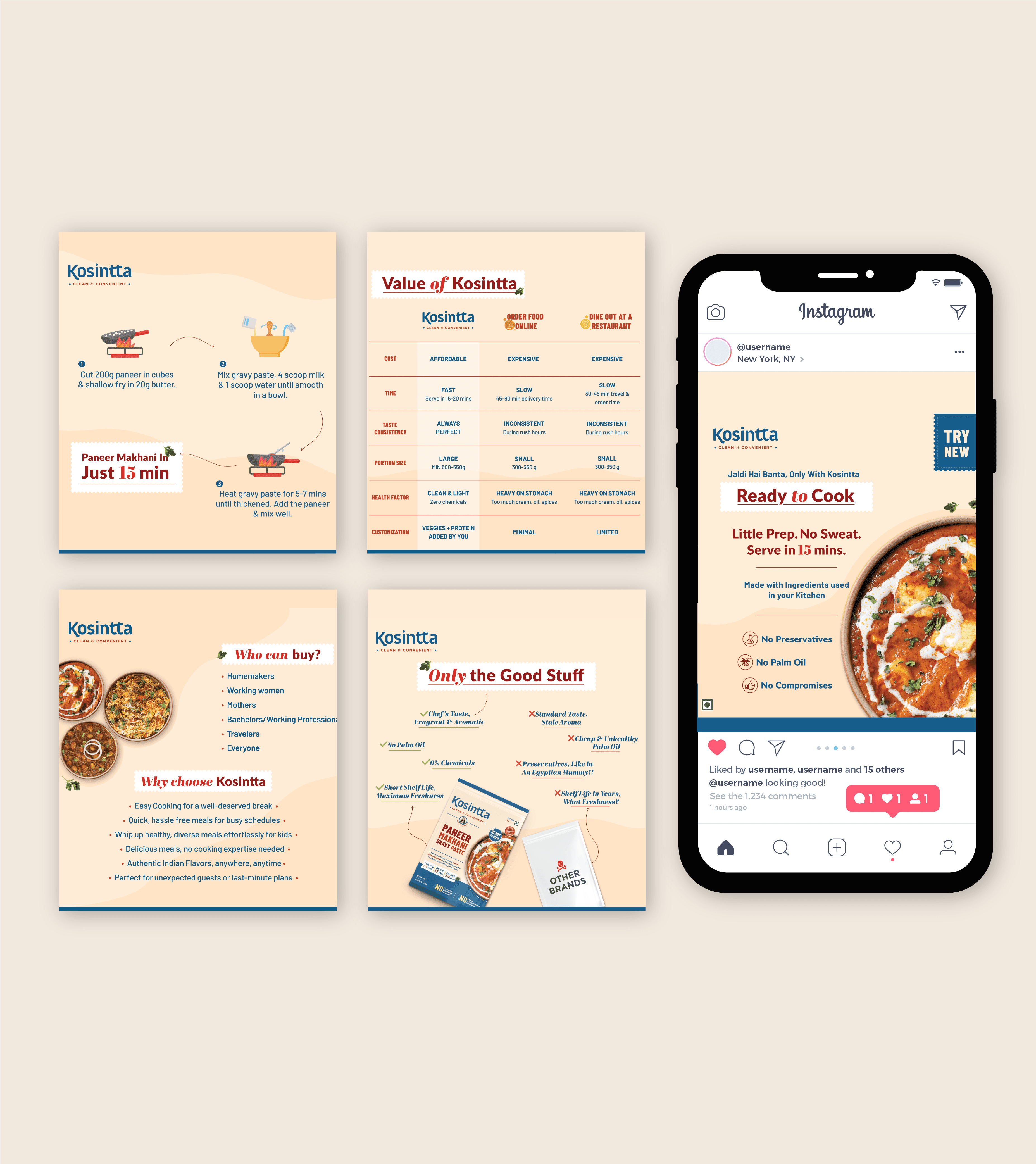 We wanted Kosintta to feel bright, friendly, and easy — very different from the usual ready-to-cook brands. The blue palette instantly set it apart on the shelf, giving the brand a fresh and confident personality. The design was kept clean and simple, with clear cooking instructions that make the process feel effortless. Every element from colour to layout was created to make the brand approachable, trustworthy and modern, while staying true to its Indian roots.