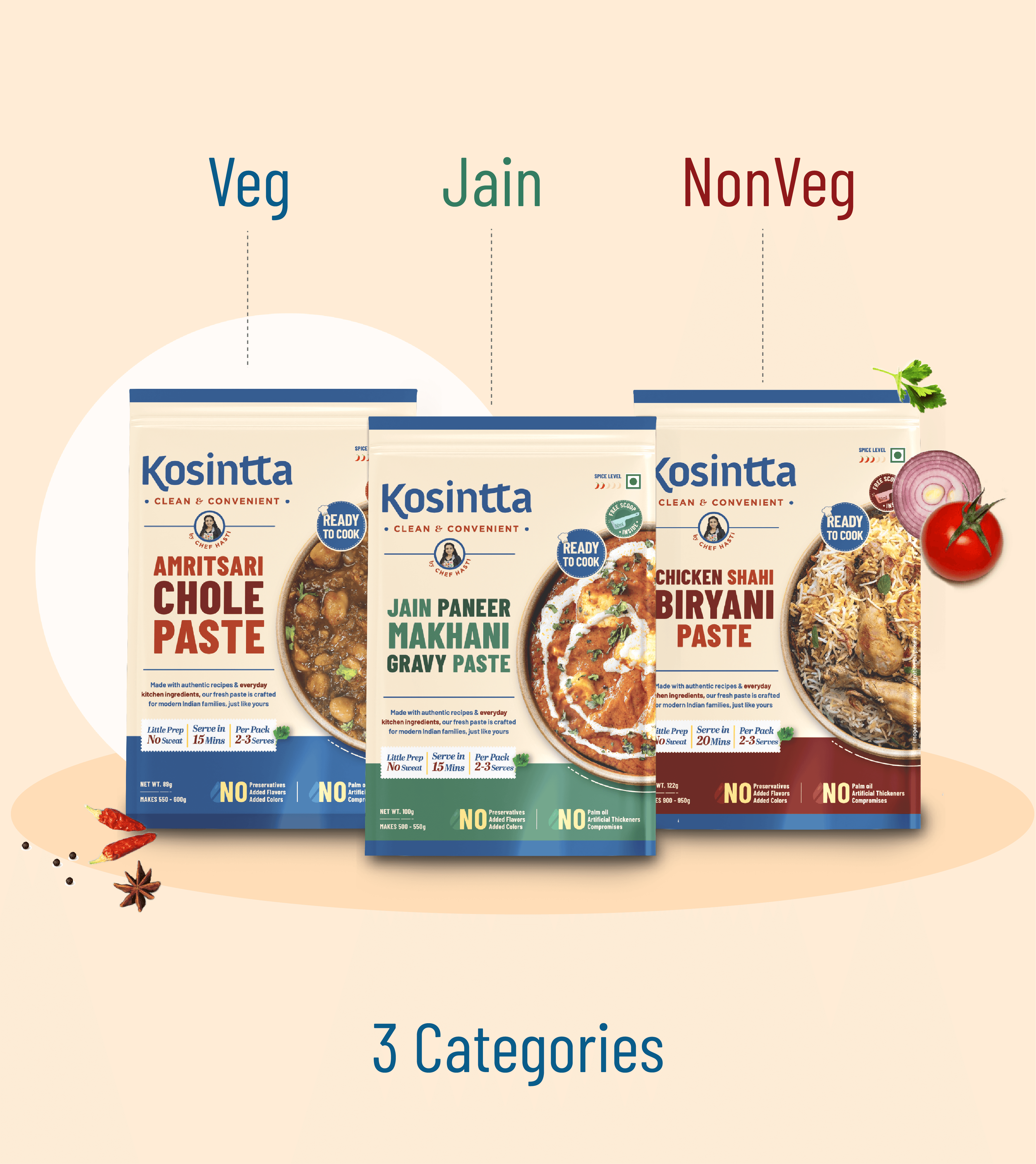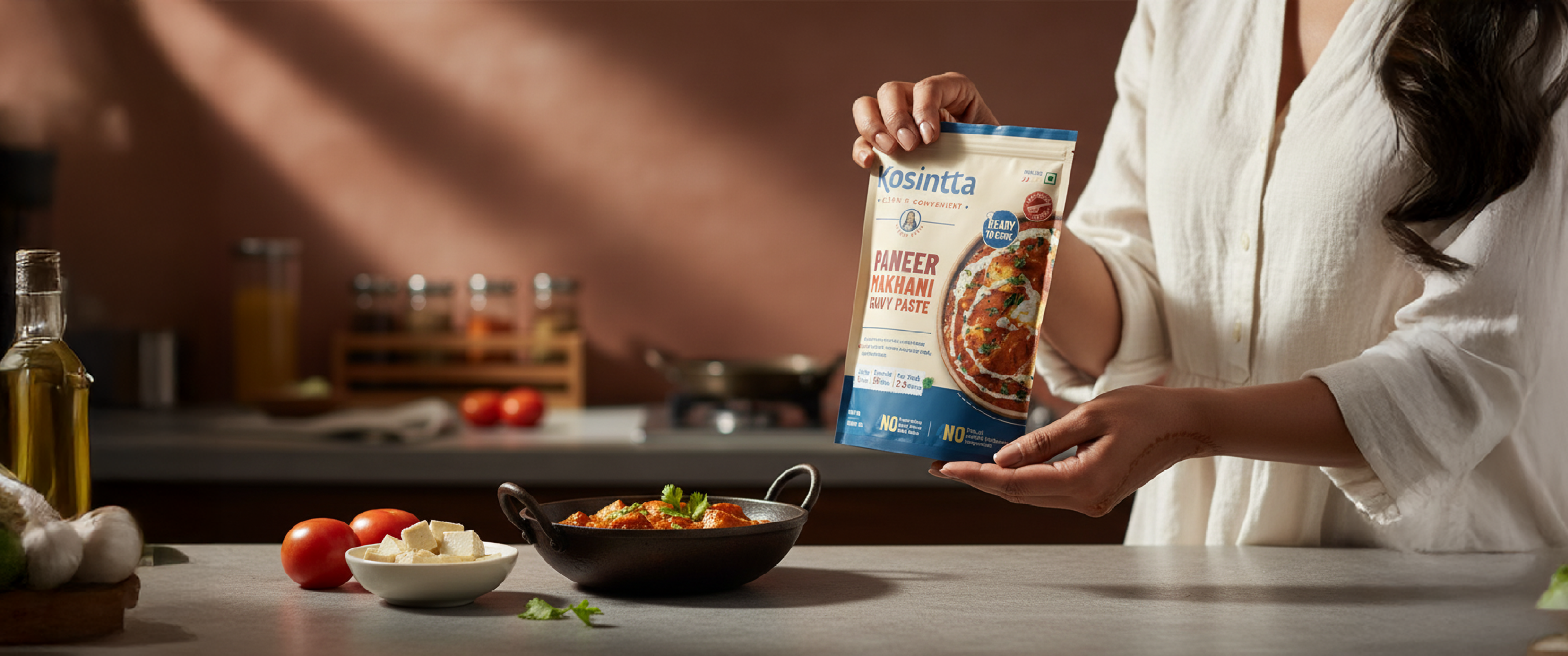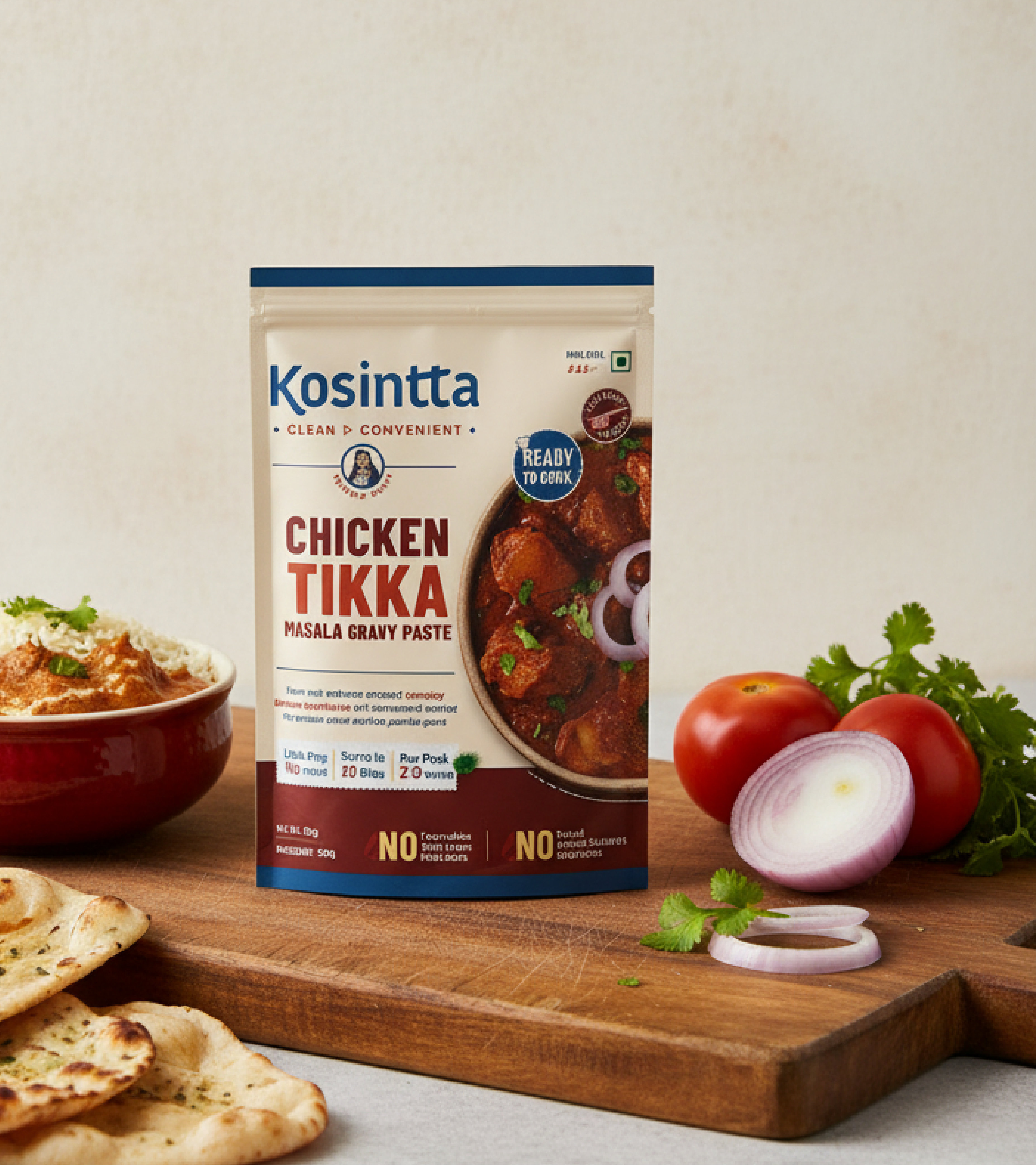 Kosintta came to us at the very beginning - with a strong idea but no defined visual direction. As a new F&B brand offering gravy pastes in veg, non-veg, and Jain options, the challenge was to build an identity from scratch that felt modern, clean, and trustworthy. The brand needed to look ready-to-cook, not ready-to-eat striking the right balance between freshness, convenience, and authenticity. Designed for a premium mass market, Kosintta’s identity had to stand out on the shelf while staying approachable and relatable to everyday home cooks.